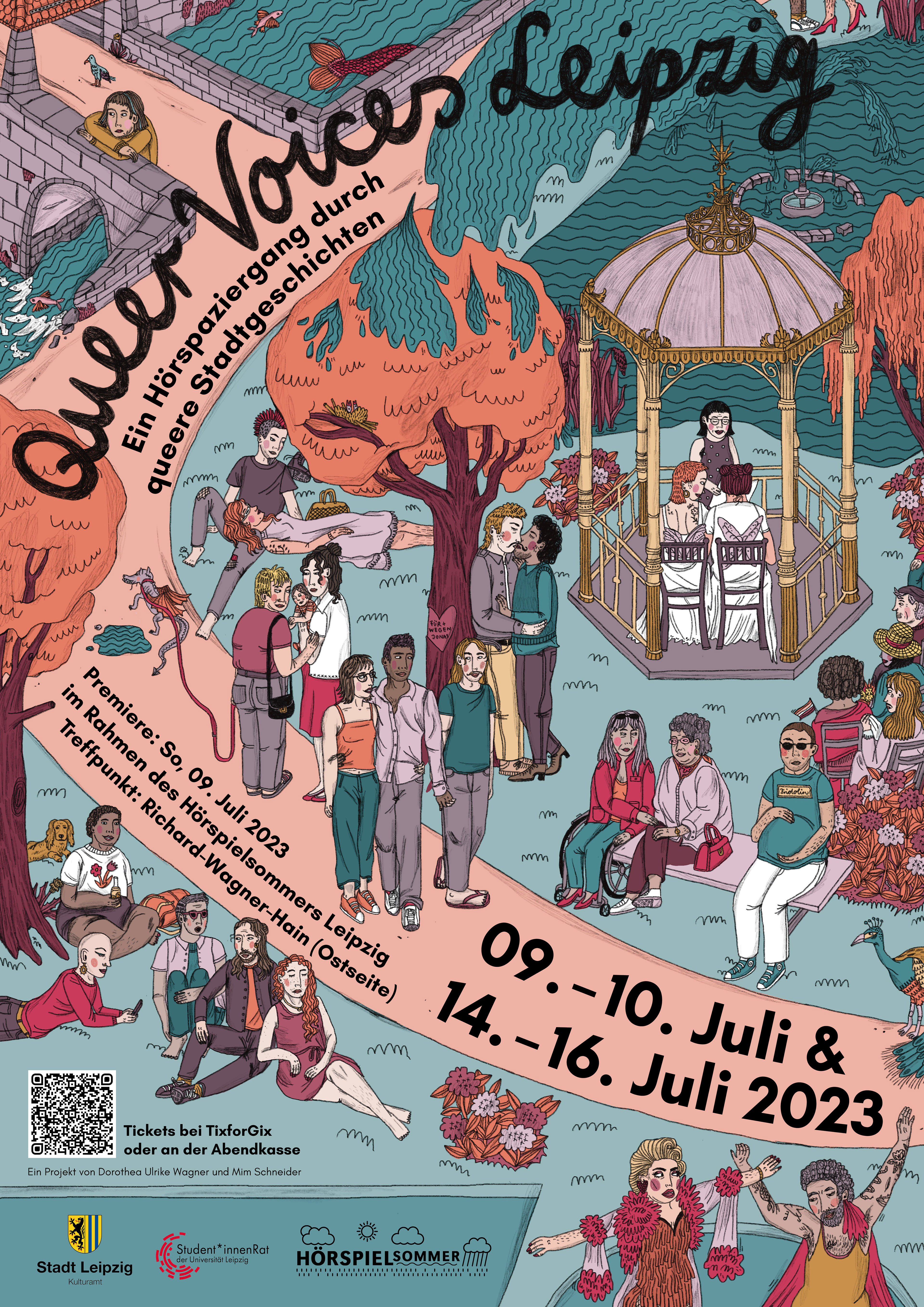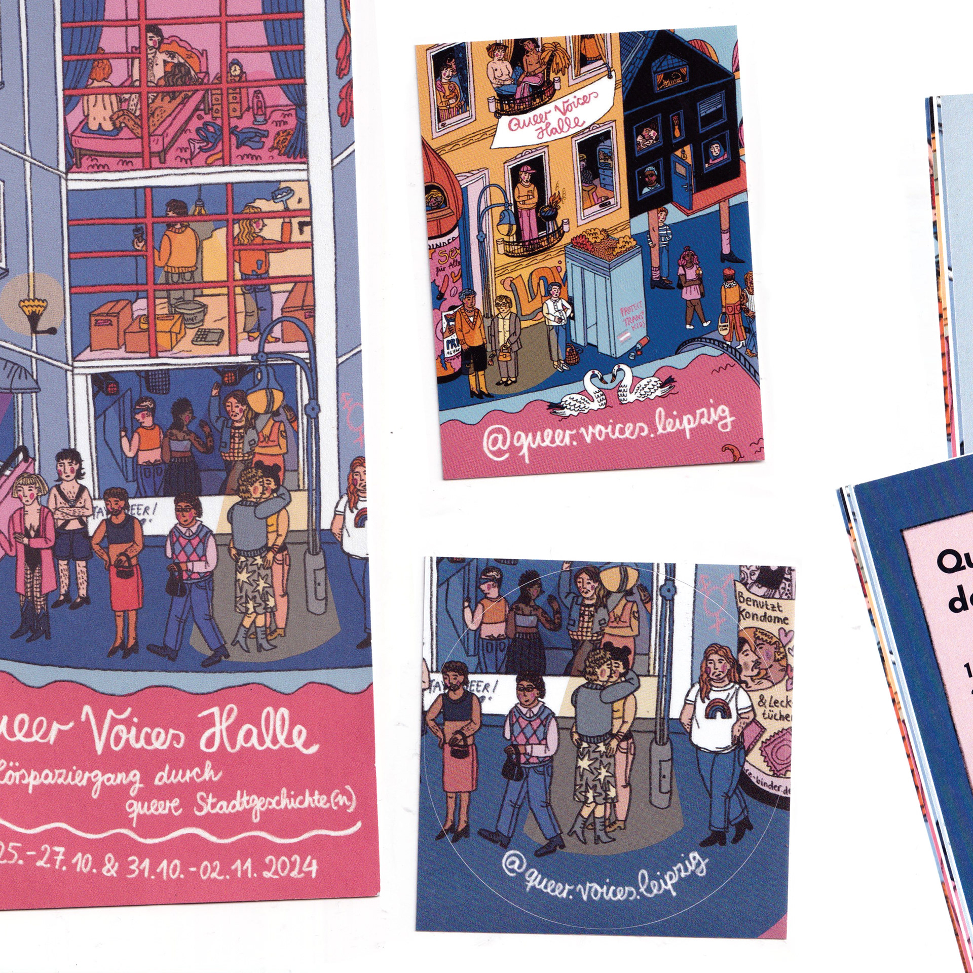 Das erste gemeinsame Projekte war der im Herbst 2023 stattfindende Audiowalk "Queer Voices Leipzig". Ich habe für die Veranstaltung Poster, Postkarte, Flyer und Sticker gestaltet. Zudem wurden die entstanden Illustrationen anderweitig genutzt.