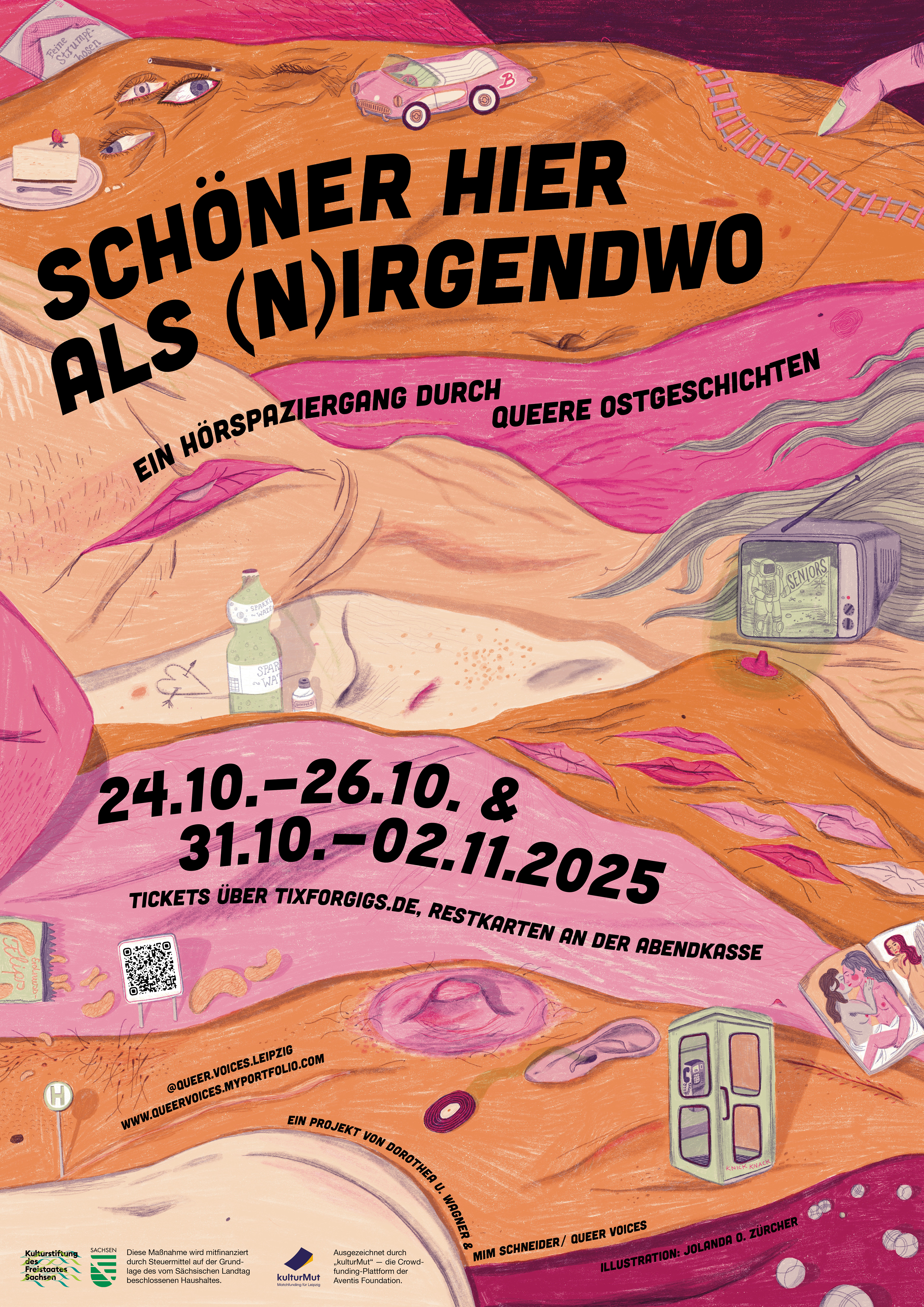 Im Herbst 2025 folgte schließlich das aktuelle Projekt "Schöner hier als (n)irgendwo – Ein Hörspaziergang durch queere Ostgeschichten", welches sich mit queere Biografien von Menschen jenseits der 55 aus Ostdeutschland beschäftigt. Auch hier habe ich Werbematerial und ein Magazin gestaltet.